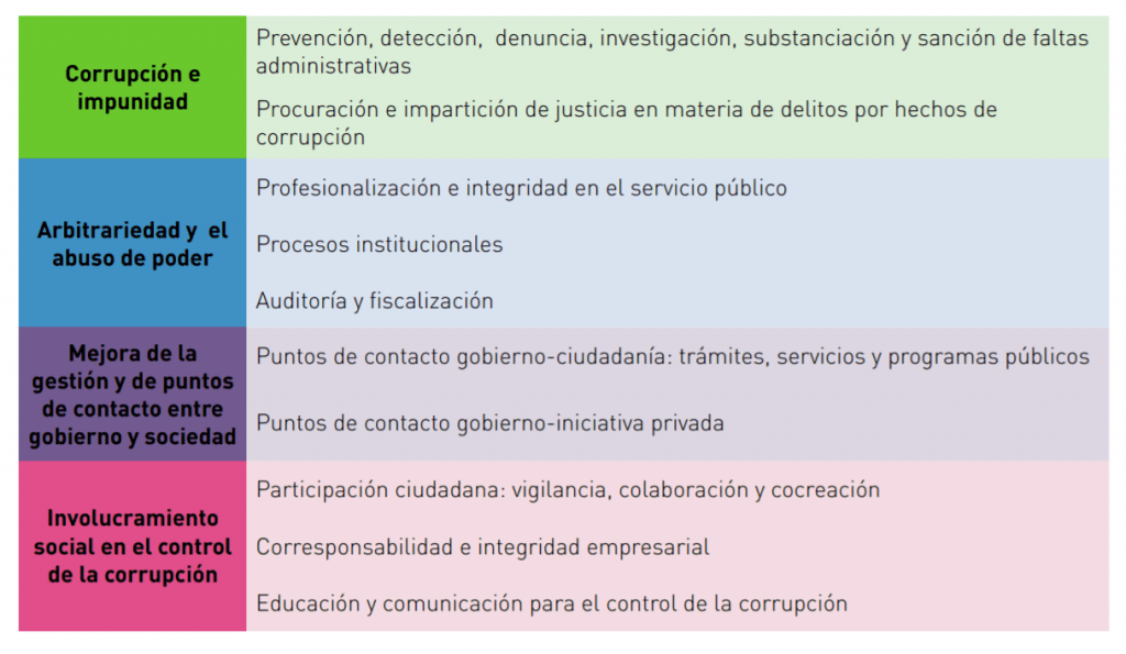 La Política Nacional Anticorrupción es un documento integrador establecido como obligatorio en la Ley General del Sistema Nacional Anticorrupción (LGSNA) con 4 ejes y 10 prioridades por eje, 40 prioridades de política pública con sus respectivos líderes de implementación que sirven de guía para el desarrollo de acciones concretas y proyectos específicos de intervención.