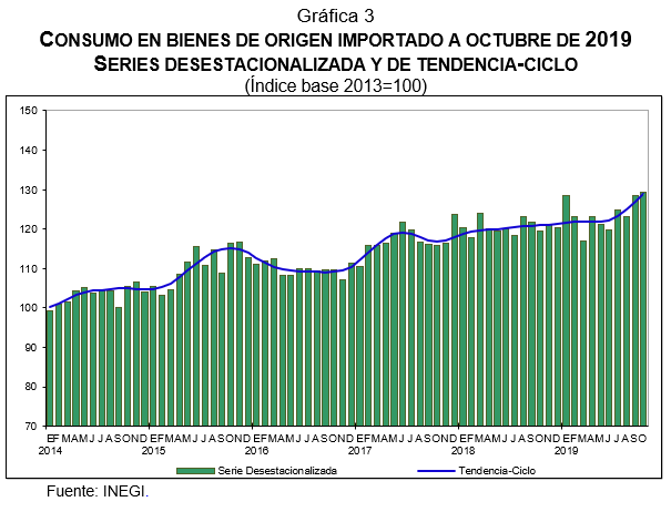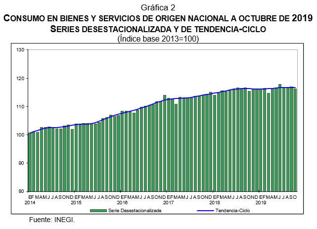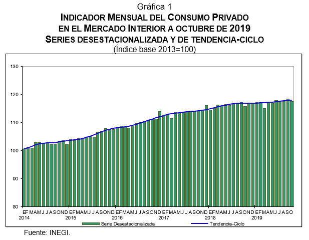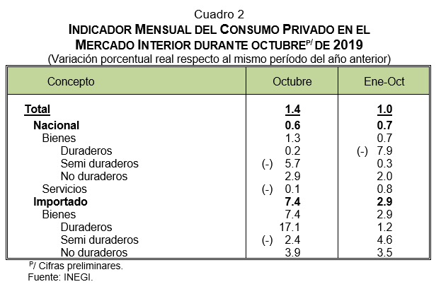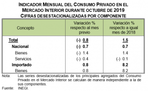 - El Indicador Mensual del Consumo Privado en el Mercado Interior disminuyó -0.8% durante octubre de 2019 frente al mes inmediato anterior