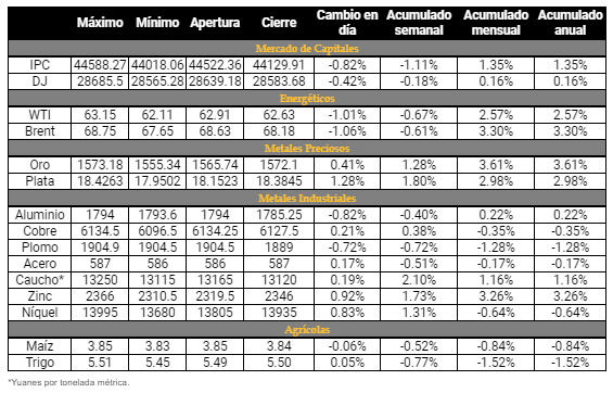 Por el contrario, el aluminio cerró la sesión con una disminución en su precio de 0.82% y cerró cotizando en 1,785.25 dólares por tonelada métrica. Las presiones a la baja se dieron ante la expectativa de que China pudiera incrementar la producción del metal en el transcurso del año.