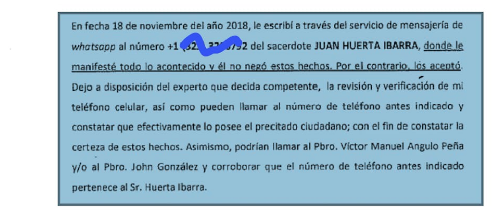 [quote]“El padre Huerta nunca niega lo sucedido. De hecho, él me dice que iba a juntar dinero para que yo fuera a México y pedirme perdón frente a la Virgen de Guadalupe, pero él no quería que yo sufriera más por él. Después, él me pedía, porque así me lo dijo, él era quien hacia las llamadas desde Estados Unidos… me pedía que le protegiera su ministerio”.[/quote]