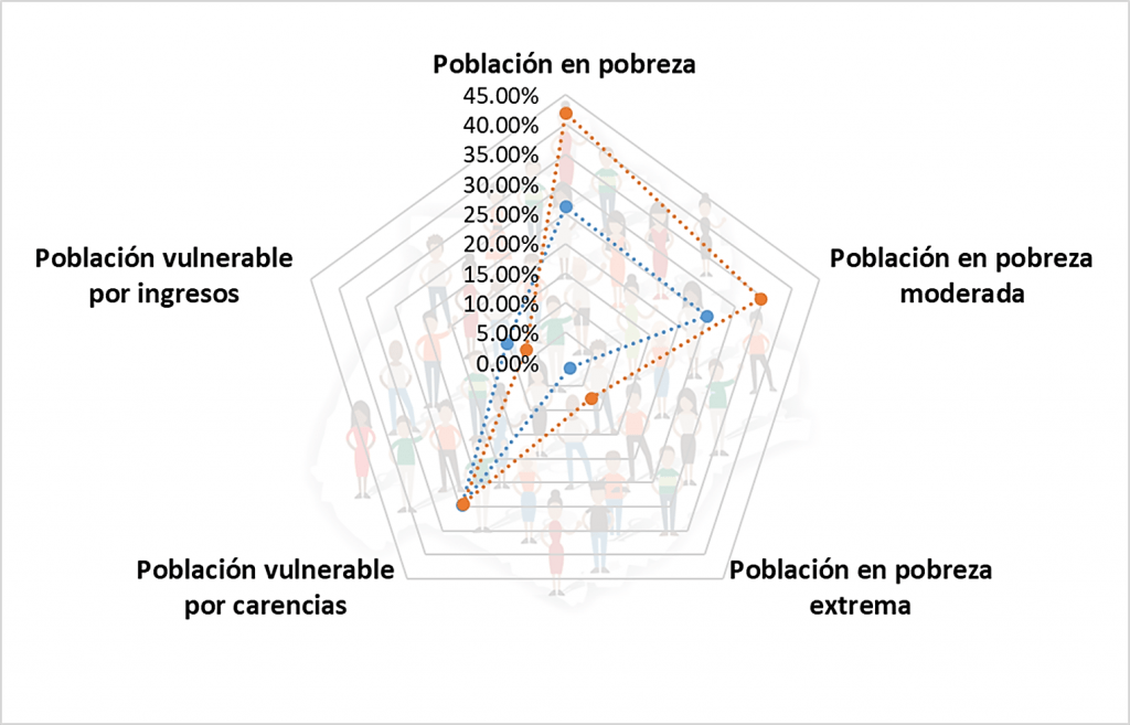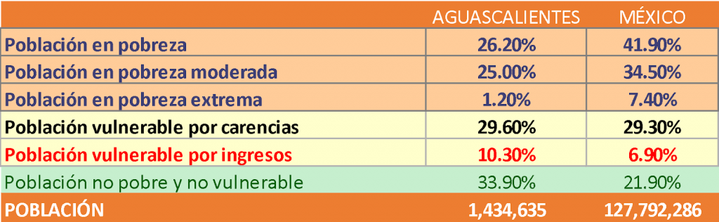 En México la población es más pobre (42%) que vulnerable (36%) y en Aguascalientes la población es más vulnerable (40%) que pobre (26%).
