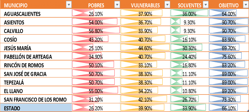*Para el municipio de El Llano se descubre a más de un tercio de sus habitantes como vulnerable (34.2%) por más de la mitad de su población como pobre (55%)