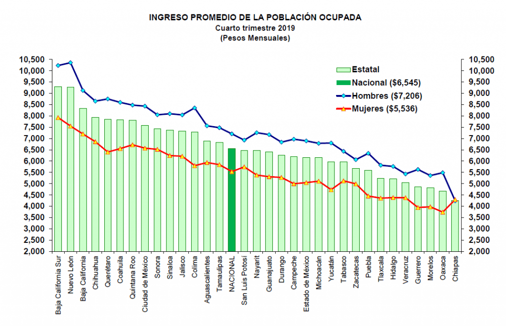El ingreso promedio por hora trabajada fue de 39.33 pesos para los hombres y 36.5 para las mujeres; mientras que el promedio de horas de trabajo remunerado a la semana por parte de los hombres fue de 45.8 y por parte de las mujeres 37.9 horas. La PEA no ocupada o desempleada correspondió a 3.4 por ciento de la población masculina y la femenina, 3.3. Como resultado de la diferencia en la participación económica de hombres y mujeres, en la población adulta mayor (60 años y más) se refleja en la tasa de jubilación de la población de 60 años y más edad fue de 27.3 para los hombres y 11.5 por ciento para las mujeres.