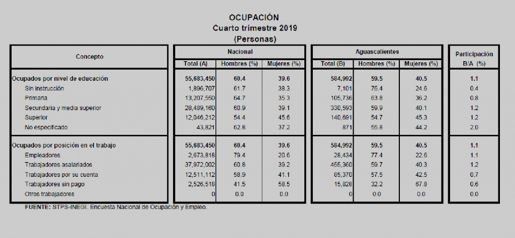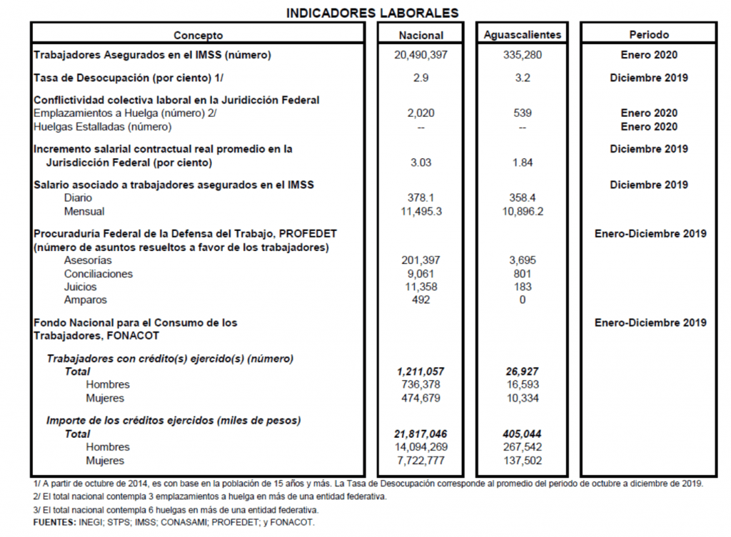 La STPS informó, en su reporte laboral al cuarto trimestre del 2019, que se encuentran en Aguascalientes el 1.63% de los trabajadores mexicanos asegurados en el IMSS, lo que significa una cifra muy superior a la de su participación demográfica del 1.1% nacional. La tasa de desocupación disminuyó la cifra, pero siguió semejante a la del país en general (3.2%); a diferencia de la de hace unos meses de 3.8%.