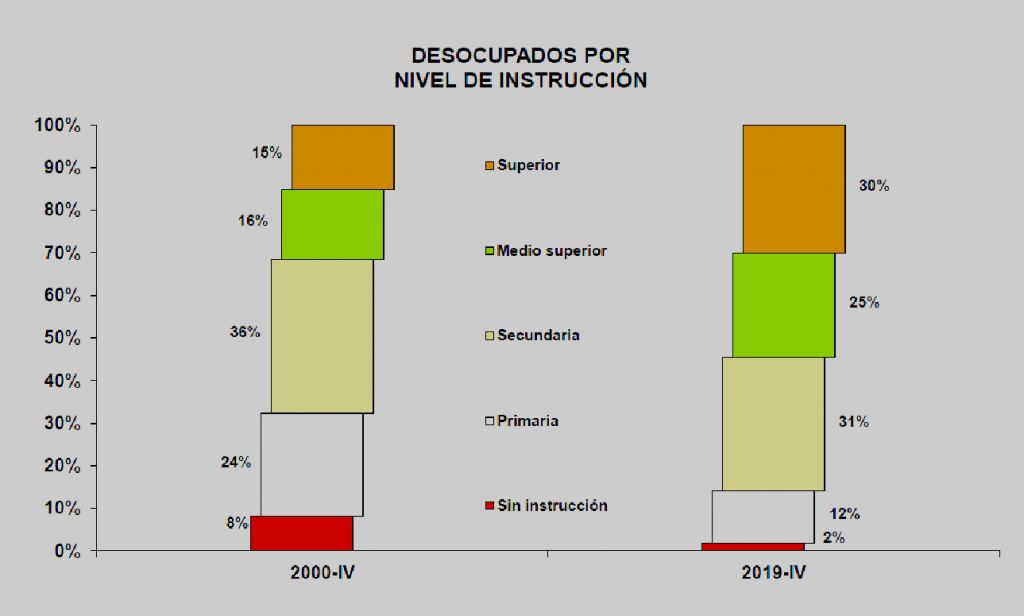 Por escolaridad o nivel de instrucción, en los últimos 19 años se ha venido modificado el perfil del desempleado: el 45% cuenta con estudios de educación media o superior, 14% más que en el año dos mil; 31% de los desocupados tienen instrucción secundaria y sólo 14 de cada cien cuentan con primaria o están sin instrucción, cuando en el 2000 eran tres de cada diez.
