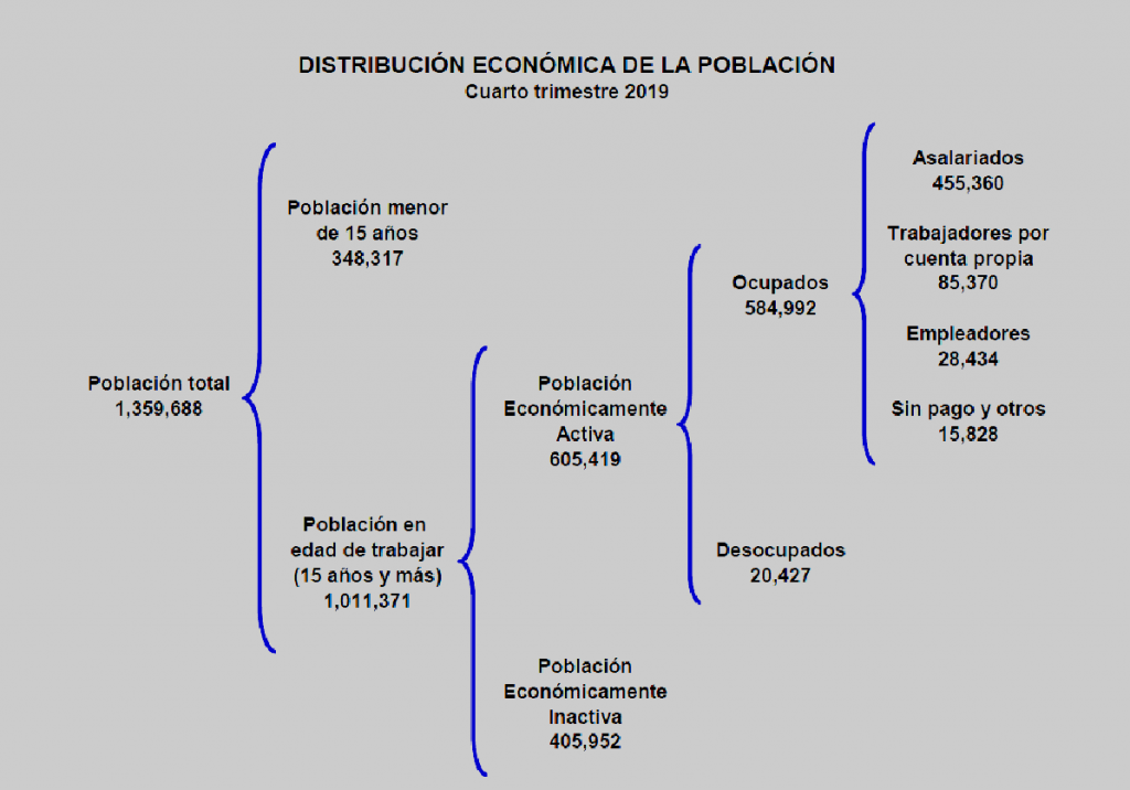 La población económicamente activa (PEA) del estado, la reportan con 605 mil 419 efectivos, de la cual la mayoría 584 mil 992, se encuentran ocupados; predominan los asalariados con 445 mil 360. Para el cuarto trimestre del 2019 el número de empleadores aumentó sumando 28 mil 434. Por su parte, los “cuenta propia” se han venido incrementando, contando ahora con 85 mil 370.