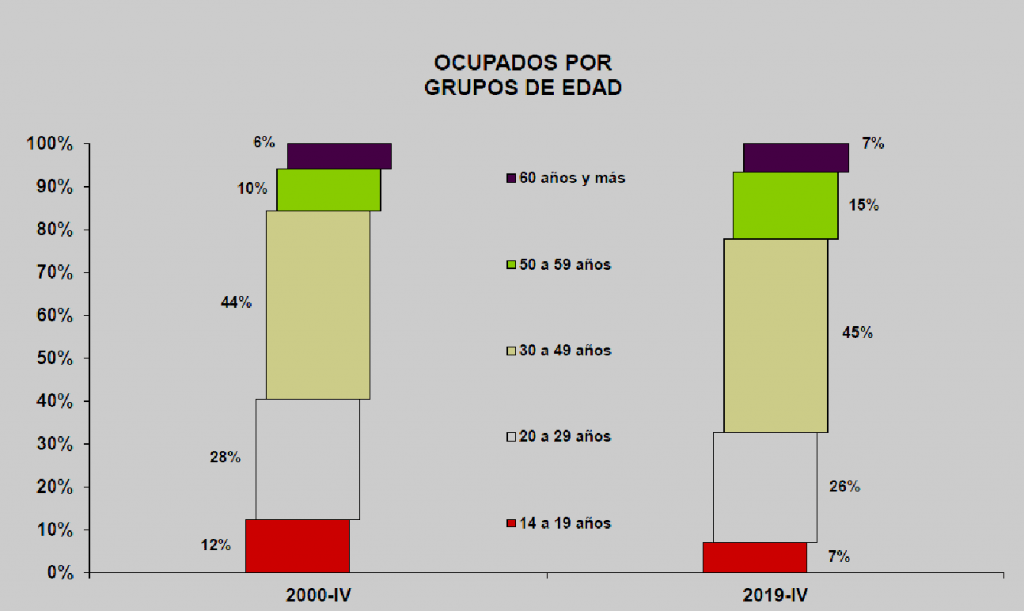 Analizando la evolución de los indicadores laborales tenemos que, en los segmentos establecidos por edades, los cambios más importantes se han dado en los dos grupos extremos. Veamos, por un lado, al grupo de jóvenes de entre 14 y 19 años que ha reducido su porcentaje de participación casi a la mitad, pasando del 12% al 7% en 19 años. Los siguientes grupos, conservan un porcentaje semejante de participación hasta los 49 años (70%); pero a partir de los cincuenta años la ocupación laboral está aumentando, durante el mismo lapso (19 años), pasó del 16% al 22%, es decir, que contrario al fenómeno de los más jóvenes, los adultos maduros y los adultos mayores, tienden a incrementar su participación laboral en el tiempo.