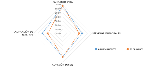 Aguascalientes aparece evaluado con 66.15 puntos ubicándose entre las ciudades de calificaciones intermedias, pero en el quinto lugar de la región denominada Occidente, después de Colima, Guanajuato, Manzanillo y Zapopan.