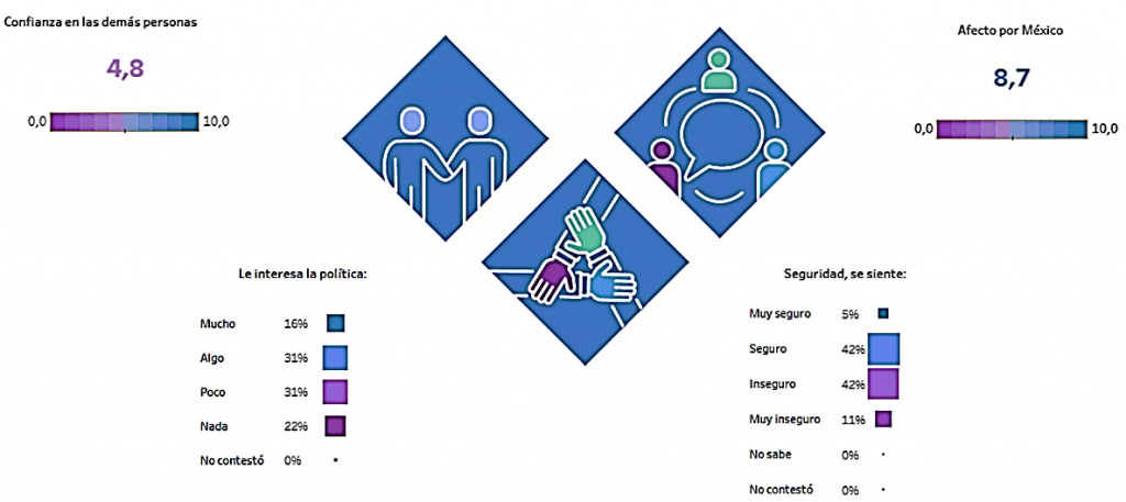 En el Índice de Cohesión Social, que está compuesto por factores medidos a través de un número de ítems re-escalados del 0 al 10 se incluyen nueve variables que pertenecen a tres dimensiones: 1) relaciones sociales, 2) conectividad, y 3) enfoque en el bien común. El menor valor en cohesión social de 2019 es de 5.23, 0.13 puntos más alto que el mínimo de 2018. Mientras que el mayor valor es de 6.23, 0.19 puntos menor al valor más alto del año anterior. El promedio general de cohesión social es de 5.71, apenas 0.04 puntos más alto que en 2018.