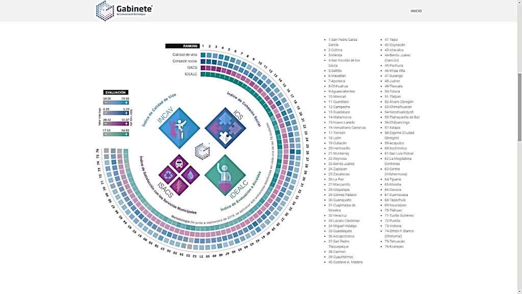 El estudio es una guía comparativa para optimizar la toma de decisiones de acuerdo con las opiniones sociales, políticas, económicas y culturales de cada localidad. El instrumento contempla indicadores estandarizados con validez internacional -satisfacción de vida y cohesión social-, lo cual permite realizar comparaciones con otros países. Por otro lado, el Gabinete incluye indicadores desarrollados para medir las características particulares de cada región, cultura y forma de gobierno, así como las fórmulas para evaluar autoridades locales y los servicios que prestan sus administraciones. De hecho, la investigación permite entender los contextos urbanos de manera comparativa al aplicar el mismo protocolo en todas las ciudades.