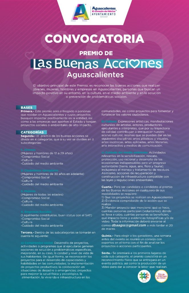 En alianza del municipio de Aguascalientes y la Consultoría Favent, este año se lanza la convocatoria al premio de las Buenas Acciones que tiene por objetivo reconocer a los jóvenes, mujeres, hombres y empresas en Aguascalientes, que buscan impactar de forma positiva su entorno.