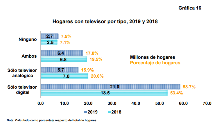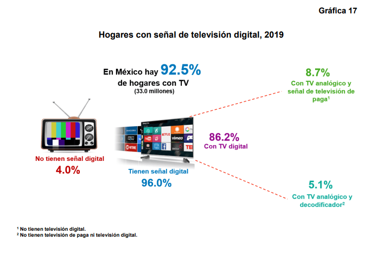 Los hogares que cuentan con un televisor analógico y reciben señal por medio de un decodificador representan un 5.1 por ciento del total. De esta manera, el 96.0% de los hogares del país reciben la señal de televisión digital a partir de alguno de los tres medios mencionados anteriormente: televisor digital, señal de televisión de paga o decodificador.