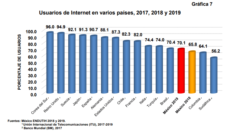 Si bien se ha avanzado en la penetración de Internet en nuestro país, la proporción respecto de otras naciones del mundo es menor. En países como Corea del Sur, Reino Unido, Alemania y Suecia, nueve de cada diez personas son usuarias de Internet; mientras que en México la proporción es siete de cada diez personas, una persona más respecto de 2018; conviene señalar que esta cifra es mayor a la registrada en países como Colombia y Sudáfrica.