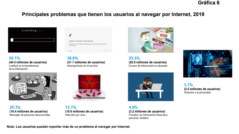 Con relación a los principales problemas que los usuarios de Internet identifican al conectarse con la red, la ENDUTIH 2019 estima que el 50.1% de los usuarios respondieron que son debido a la lentitud en la transferencia de la información; el 38.6% declaró interrupciones del servicio, el 25.5% mencionó que existe un exceso de información no deseada y el 20.3% recibió mensajes de personas desconocidas. Sólo el 13.1% de los usuarios de Internet declaró que el principal problema es el riesgo de infección por virus en sus dispositivos, el 4.0% fraudes con información y el 3.1% violación a la privacidad.