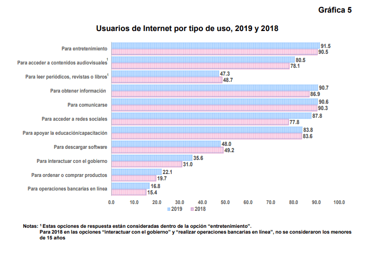 Entre las principales actividades de los usuarios de Internet en 2019, están para entretenimiento (91.5%), obtención de información (90.7%) y comunicarse (90.6%). En contraste, las actividades que menos realizan los usuarios de Internet son operaciones bancarias en línea (16.8%), ordenar o comprar productos (22.1%) e interactuar con el gobierno (35.6 por ciento).