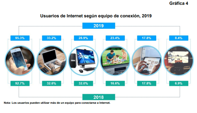 Tomando en cuenta los dispositivos utilizados para conectarse a Internet, en 2019, la ENDUTIH da a conocer que el 95.3% de los usuarios de Internet se conectaron a través de un celular inteligente (Smartphone), el 33.2% lo hizo por medio de una computadora portátil, el 28.9% utilizó una computadora de escritorio, el 23.4% de los usuarios de Internet se conectó a través de un televisor con acceso a Internet (Smart TV) o algún dispositivo conectado a ésta, el 17.8% por medio de una Tablet y un 8.4% a través de una consola de videojuegos.