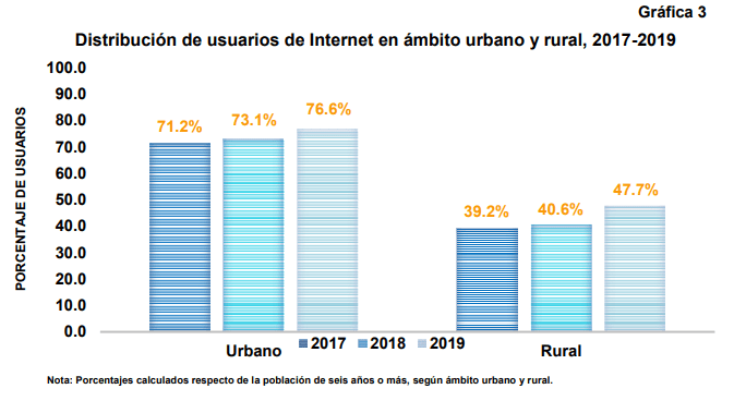 Como se comentó anteriormente, la ENDUTIH 2019 presenta resultados para los ámbitos urbano y rural; por lo que la encuesta estima que el 76.6% de los usuarios de Internet, respecto de la población total de seis años o más, está concentrada en la zona urbana y el 47.7% en la rural.