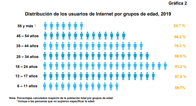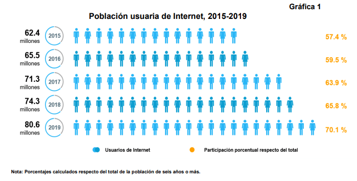 La ENDUTIH estima que en 2019 hay 80.6 millones de usuarios de Internet, que representan el 70.1% de la población de seis años o más. Esta cifra revela un aumento de 4.3 puntos porcentuales respecto de la registrada en 2018 (65.8 por ciento).