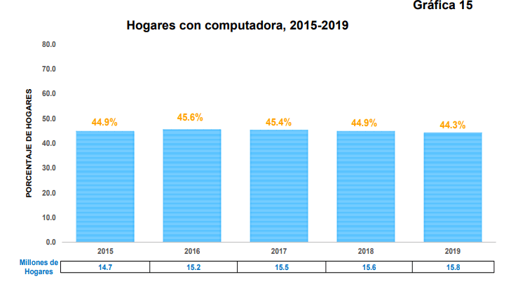 En 2019 la proporción de hogares que disponen de computadora registró un descenso marginal, al pasar de un valor de 44.9% en 2018 a 44.3% en 2019, lo que significa una reducción de 0.6 puntos porcentuales.