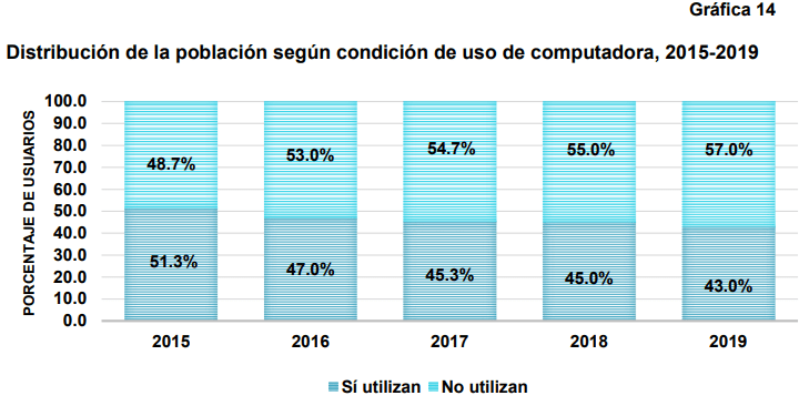 Durante 2019 los usuarios de computadora de seis años o más alcanzaron los 49.4 millones, lo que representa un 43.0% del total de la población en este rango de edad. Asimismo, el porcentaje de usuarios de computadora observado es menor en 2.0 puntos porcentuales respecto del registrado en 2018.