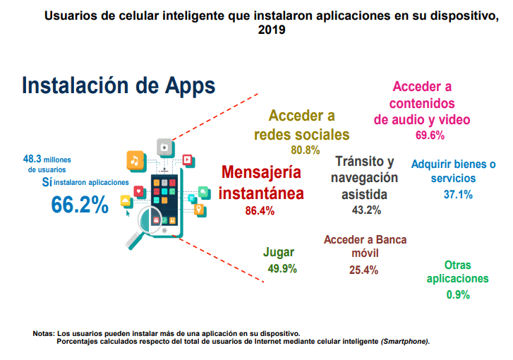 En 2019, la ENDUTIH estima que 48.3 millones de los usuarios de Internet mediante celular inteligente (Smartphone) instalaron aplicaciones en sus teléfonos. De estos, el 86.4% instaló aplicaciones de mensajería instantánea, el 80.8% para acceder a redes sociales y el 69.6% instaló aplicaciones para acceder a contenidos de audio y video. Por otra parte, el 25.4% de los usuarios utilizaron su dispositivo para instalar alguna aplicación que les permitiera acceder a la banca móvil.