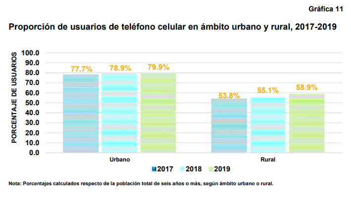 Respecto de la distribución de usuarios de telefonía celular en los ámbitos urbano y rural, la encuesta estima que para 2019, el porcentaje de usuarios de esta tecnología en el área urbana es de 79.9%, lo que corresponde a 71.2 millones de usuarios, que representa un incremento del 1.1 porcentual respecto del año 2018. Mientras que, en el área rural, el porcentaje de usuarios de esta tecnología es de 58.9%, lo que corresponde a 15.3 millones de usuarios, siendo esta última la que presenta una mayor variabilidad respecto del año anterior, al incrementarse un 3.8 por ciento.