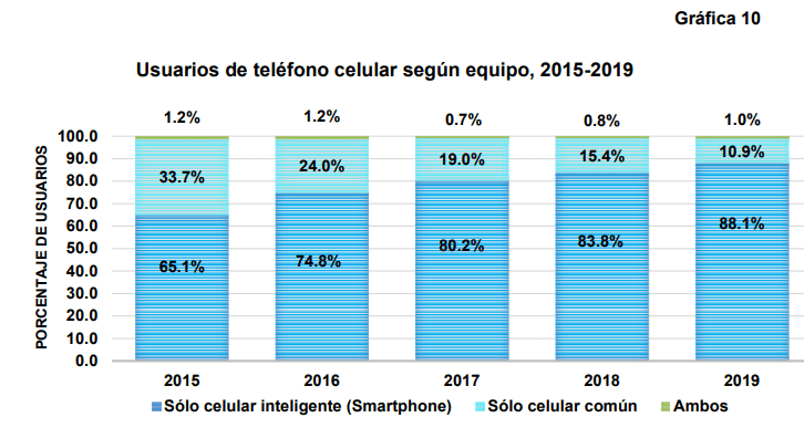 Entre 2018 y 2019, el número total de usuarios que sólo dispusieron de un celular inteligente tuvo un crecimiento de 9.5 puntos porcentuales, es decir, que pasó de 69.6 millones de personas a 76.2 millones. Esto significa que, entre los dos años, la diferencia porcentual de usuarios de este tipo de teléfonos fue de 4.3%, pues en 2018 representaban el 83.8% y en 2019 el 88.1 por ciento.