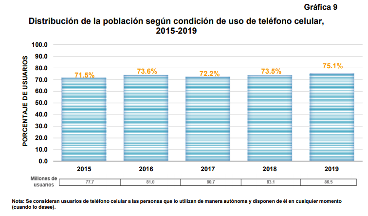 La ENDUTIH también capta la disponibilidad y uso de la telefonía celular, que se ha constituido como una de las tecnologías de mayor uso entre la población. En este sentido, la encuesta estima que en 2019 se cuenta con 86.5 millones de usuarios de esta tecnología, lo que representa que el 75.1% de la población de seis años o más.