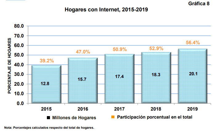 La encuesta estima que en 2019 hay 20.1 millones de hogares que disponen de Internet (56.4% del total nacional), ya sea mediante una conexión fija o móvil, lo que significa un incremento de 3.5 puntos porcentuales con respecto del año anterior.