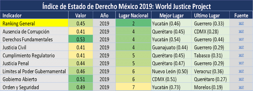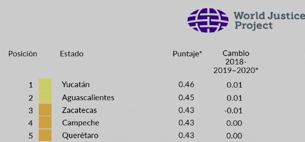 Los estados con los puntajes más altos en el Índice de Estado de Derecho en México 2019–2020 fueron Yucatán (0.46), Aguascalientes (0.45) y Zacatecas (0.43). Estos mismos estados lideraron el ranking en la edición de 2018 del Índice. Los estados en los lugares más bajos fueron Guerrero (0.33), Puebla (0.35), y Quintana Roo (0.35). En la edición pasada, Guerrero también se ubicó al final del ranking.