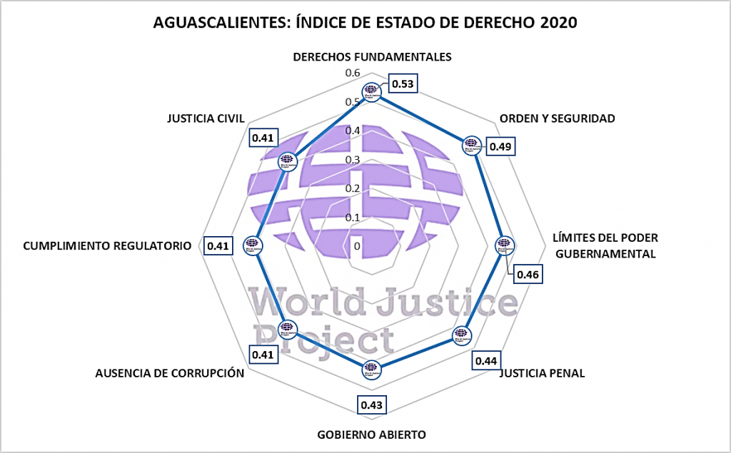 Si bien Aguascalientes se ubica en segundo lugar nacional, debe considerar las buenas prácticas en materia de Estado de Derecho impulsadas en  Yucatán, primer lugar general y primero en tres de los ocho factores; pero también en el vecindario regional aparecen punteros importantes como Querétaro, primero en cuatro factores, pero último en Gobierno Abierto, y Guanajuato primero en Justicia Civil.