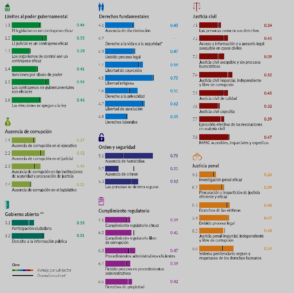 Para el Índice de Estado de Derecho del World Justice Project (WJP), los puntajes oscilan entre 0 y 1, donde 1 indica la máxima adhesión al Estado de Derecho. Ningún estado llega a una calificación perfecta; de hecho, las puntuaciones más altas no llegan a la mitad del puntaje, por lo que todos los estados tienen retos persistentes en las diferentes dimensiones del Estado de Derecho.