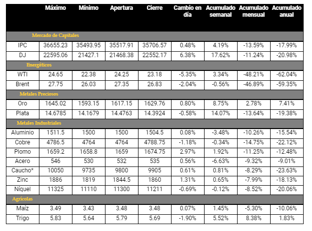 El oro cerró la sesión con ganancias, cotizando en 1,504.5 dólares por onza, lo que equivale a un aumento en su precio de 0.80%. Las presiones al alza se dieron tras la publicación de las solicitudes iniciales de apoyo por desempleo de la semana pasada, las cuales aumentaron a 3 millones 283 mil solicitudes, su máximo histórico.
