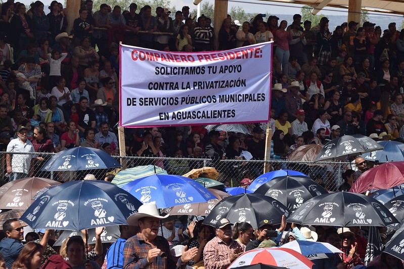 Durante la espera se hizo notar la ausencia de carteles o lonas que mostraran peticiones, reclamos o halagos para el jefe del ejecutivo federal, sin embargo, al momento de su llegada, algunas fueron levantadas y, otras, retiradas. La pancarta más notoria era una queja al gobierno municipal, decía: “Compañero presidente: solicitamos tu apoyo contra la privatización de servicios públicos municipales en Aguascalientes”, la cual estaba justo enfrente de López Obrador. Del tema no se hizo ningún comentario en su discurso, sólo se mencionó que se trabajaría con el plan hídrico.