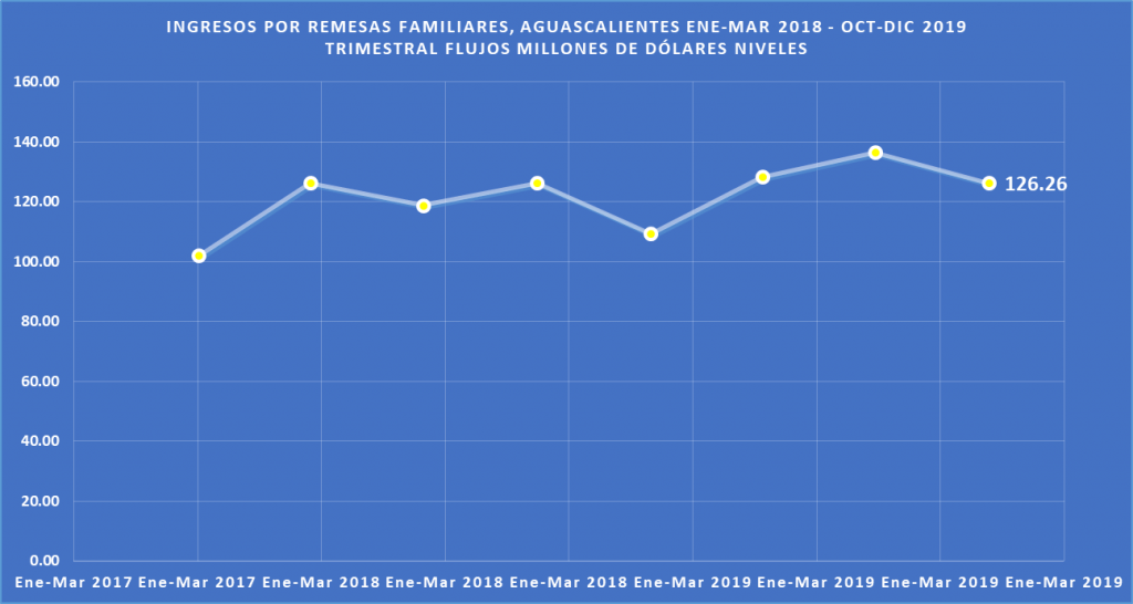 Para el Banxico, Aguascalientes en el 2018 recibió 473.25 millones de dólares, para un promedio de 1.3 millones de dólares diarios, prácticamente un dólar por persona todos los días. Al cierre del 2019 la cantidad rebasó por primera vez, desde que se lleva registro, los 500 millones de USD anuales recibidos por concepto de remesas en Aguascalientes, lo que eleva la cifra a un millón 400 mil dólares recibidos de forma cotidiana. El incremento de remesas se ha justificado por el envío de reservas ahorradas por migrantes indocumentados, que temen ser deportados sin poder retirar de sus domicilios esas reservas y los envían con ánimo de que se emprenda con ellas algún negocio que les permita sobrevivir si sufren el retorno.