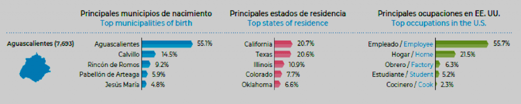 Es importante saber que las y los migrantes hidrocálidos se dedican a desarrollar labores relacionadas con profesiones y oficios muy demandados en la Unión Americana. Más de la mitad son empleados; una de cada cinco personas se dedica al hogar y el resto en gran medida se dedica a ser obrero, estudiante o cocinero, la gente de Aguascalientes no cuenta con mucha población dedicada al campo, pero sí a rubros como la salud y la educación.