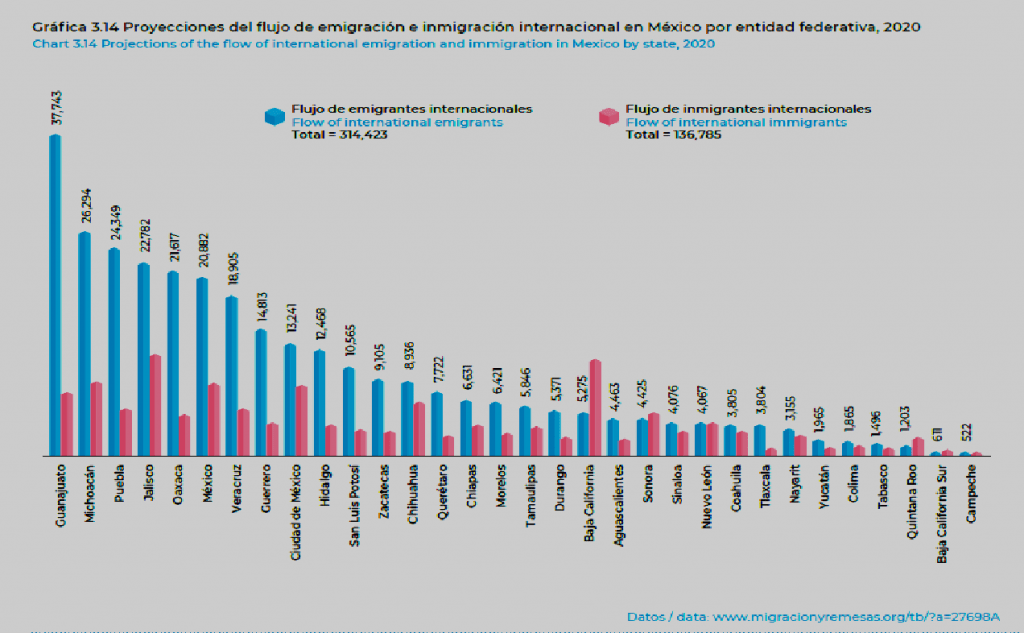 Para el séptimo Anuario de Migración y Remesas del Conapo y la fundación BBVA en 2020, emigrarán 37 mil 700 personas de Guanajuato y será la entidad federativa con mayor emigración. En 2020, recibirán el mayor flujo de población inmigrante: Jalisco (12.1 mil personas), Baja California (11.9) y Michoacán (8.9). El 62.8% de la población mexicana con matrícula consular reside en: California (28.8%), Texas (22.6%), Illinois (8.1%) y Nueva York (3.3%). Los últimos datos aportan que casi 7 de cada 10 personas mexicanas en Estados Unidos no tiene ciudadanía.