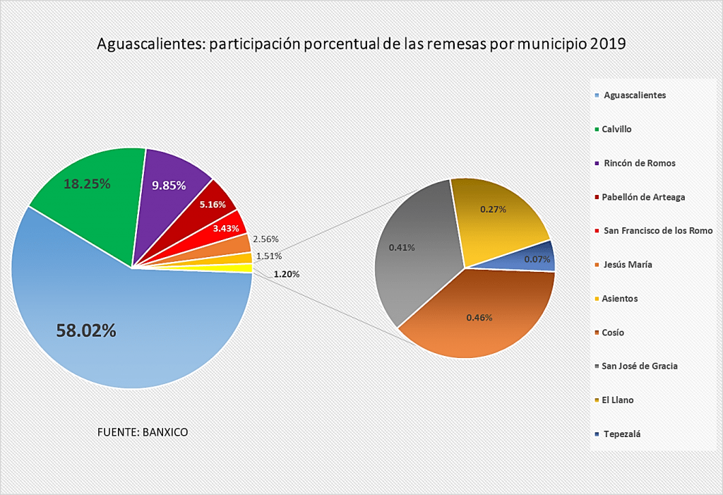 El municipio de Aguascalientes, con el 66.47% de la población del estado aporta el 55.1% de los migrantes y recibe el 58% de las remesas; Calvillo, con solo el 4.37% de los habitantes estatales, proporciona efectivos equivalentes al 14.5% y cobra el 18.25% de las remesas, es decir, más de tres y cuatro veces su participación demográfica. Rincón de Romos, con el cuatro por ciento en habitantes, aporta más del nueve por ciento en emigrantes y remesas y Pabellón con el 3.43% prácticamente participa con el 6% en los dos renglones; en cambio Jesús María con el 9.17% de la población, únicamente provee el 4.8% de los migrantes y recibe el 2.56% de las remesas, es decir, la mitad y la tercera parte de lo que demográficamente le correspondería. Los municipios de El Llano, Tepezalá, Cosío y San José de Gracia con más del 5% de la población en su conjunto sólo participan del 1.2% de las remesas del estado.