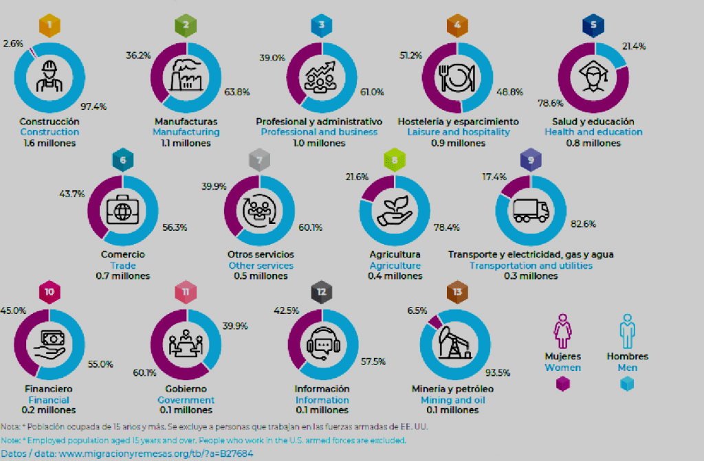 Los mexicanos, aportamos 1.6 millones de paisanos para la construcción, y 1.1 para las manufacturas; cercanos al millón tenemos los profesionales administrativos y los de hotelería y esparcimiento. En quinto lugar y con 800 mil efectivos tenemos a los dedicados a la salud y la educación, una participación femenina que destaca porque ocho de cada diez dedicados al sector son mujeres; lo que habla en gran medida de la transferencia de enfermeras para la salud.