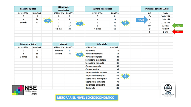 Uno de los mejores medios es la educación, particularmente la educación media, la capacitación para el trabajo y la educación abierta para adultos, jefes (a) de familia, que permiten incrementar de 10 a 20 puntos adicionales en el NSE de los hogares. Particulares avances se logran si cuentan con internet en sus viviendas (se cotiza por arriba de los 30 puntos) servicio que bien podría ser sufragado por las nuevas generaciones, que están permaneciendo durante un tiempo más prolongado en los hogares paternos.