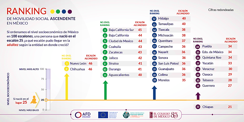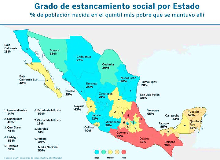 Aguascalientes se encuentra entre los primeros lugares en MOVILIDAD SOCIAL en México. De hecho, es la segunda entidad donde quienes nacen en pobreza tienen más posibilidades de alcanzar un avance socioeconómico que sus padres, con el 86%. ¿Qué tanto se mueven los que salen del quintil más pobre?, según el CEEY en el caso de Aguascalientes alcanzan hasta 40 puntos de 100 posibles, una buena cifra si consideramos que el estado que más los impulsa es Nuevo León y los mueve hasta el nivel 46/100, pero su grado de estancamiento social (28%) es del doble del registrado en Aguascalientes.