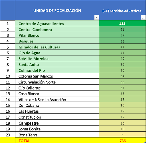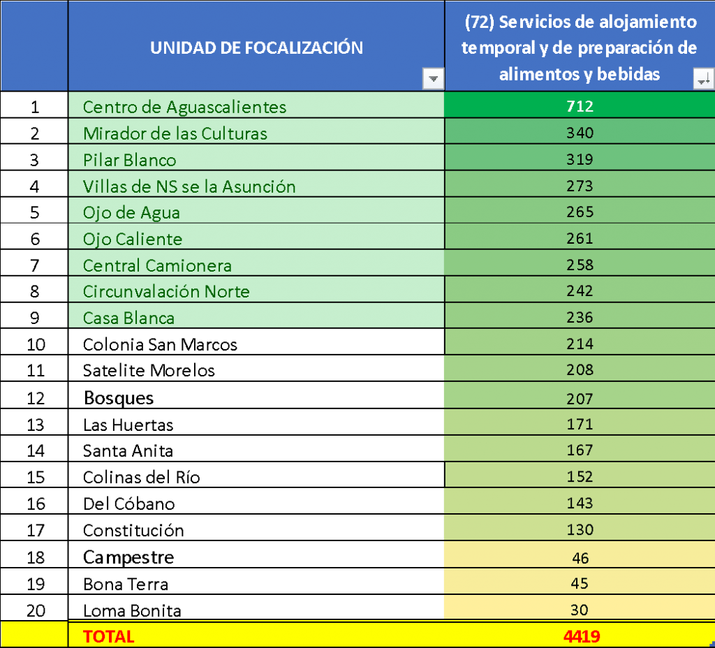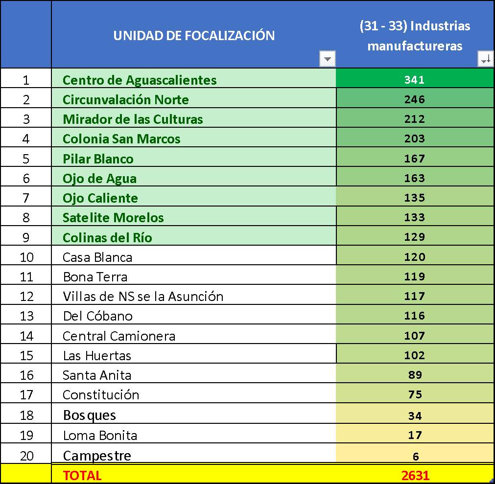 En Aguascalientes, nueve de las 20 unidades de focalización concentran a dos de cada tres unidades económicas de la ciudad. Menos de la mitad de las 20 unidades de focalización urbana concentran, según el tema, dos de cada tres unidades económicas, como el comercio al menudeo, los servicios de salud, los educativos, los de la industria manufacturera o el de alojamiento y preparación de alimentos y bebidas entre otros.