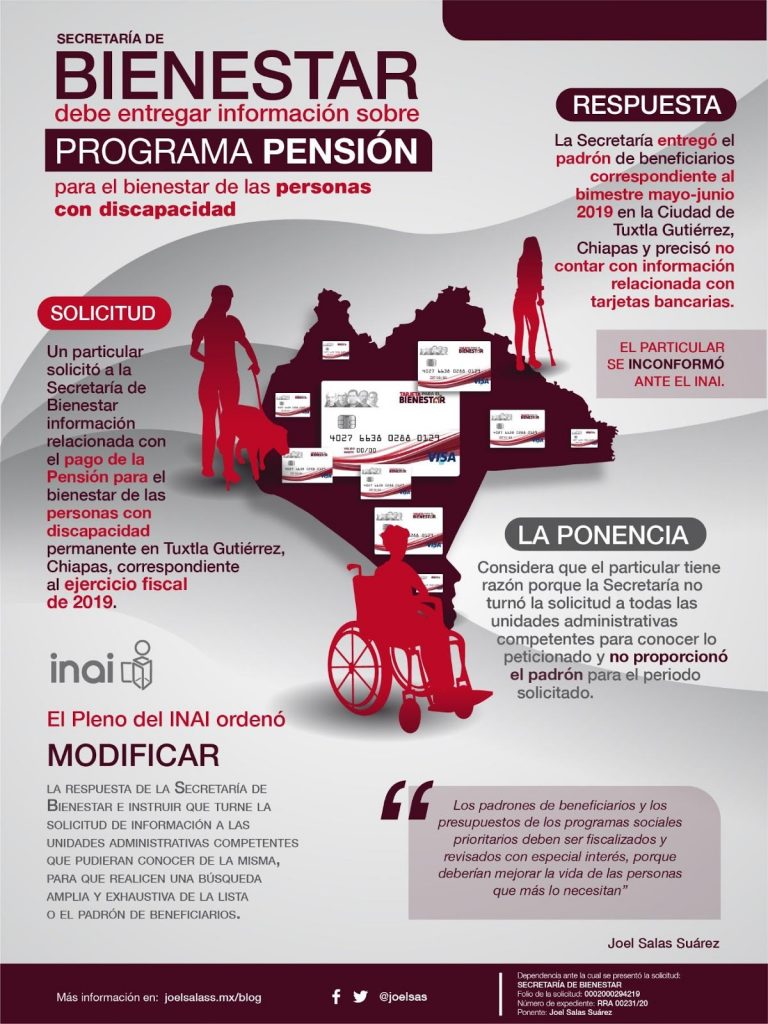 El Instituto Nacional de Transparencia, Acceso a la Información y Protección de Datos Personales (INAI) instruyó a la Secretaría de Bienestar buscar y dar conocer el padrón de beneficiarios del programa Pensión para el Bienestar de las Personas con Discapacidad, del ejercicio fiscal 2019, en Tuxtla Gutiérrez, Chiapas, así como los motivos por los cuales no todas las personas inscritas han recibido el apoyo.