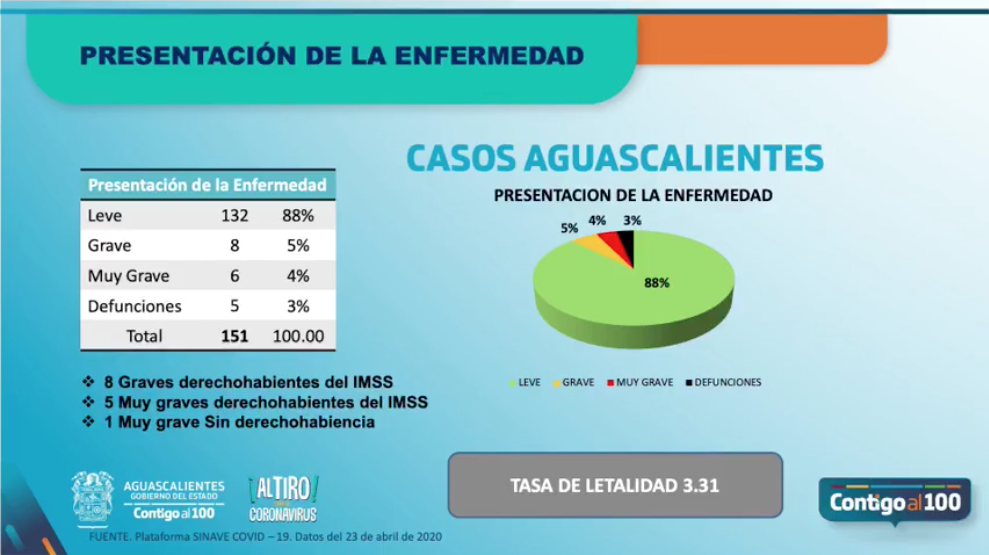 Para finalizar, se exhortó a la población en general a acatar las medidas de prevención de manera estricta y recordó que las medidas anunciadas a inicio de semana por el gobernador de Aguascalientes, Martín Orozco Sandoval, entran en completo vigor a partir de hoy, es decir, el uso obligatorio del cubrebocas en espacios públicos.