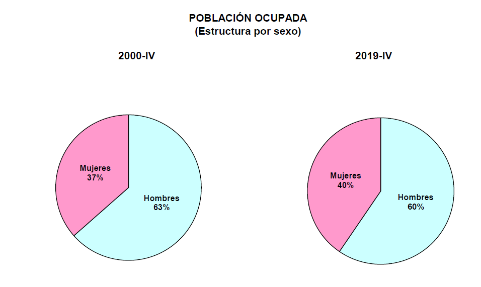 En la participación de hombres y mujeres, los valores de los varones vienen a la baja, tanto como los de las mujeres se comportan al alza. Así, la tasa masculina de participación, llegó al cuarto trimestre del año 2000 al 63%, por 37% de la femenina. Actualmente la dotación se encuentra en 60% por 40% y tiende a la igualdad para los próximos años.
