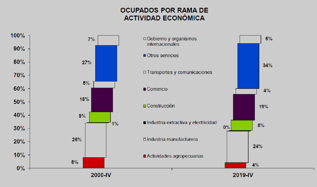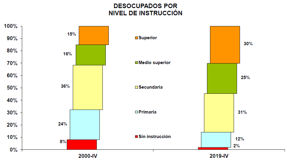 Por escolaridad o nivel de instrucción, en los últimos 19 años se ha venido modificado el perfil del desempleado: el 55% cuenta con estudios de educación media o superior, 24% más que en el año dos mil; 31% de los desocupados tienen instrucción secundaria y sólo 14% cuentan con primaria o están sin instrucción, cuando en el 2000 eran 22 de cada cien.