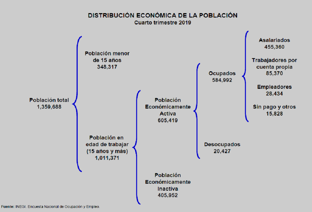 Antes de que iniciara la pandemia, la población económicamente activa (PEA) del estado, la reportaron con 605 mil 419 efectivos, de la cual la mayoría 584 mil 992, se encontraban ocupados al término del 2019; predominando los asalariados con 445 mil 360. Para el cierre del 2019 el número de empleadores se consolidó en 28 mil 434; por su parte, los “cuenta propia” se han venido incrementando paulatinamente, contando al cierre con 85 mil 370.