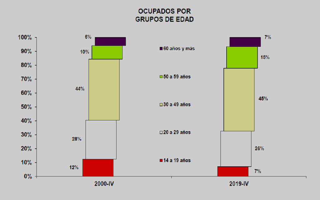Analizando la evolución de indicadores laborales tenemos que, en los segmentos establecidos por edades, los cambios más importantes se han dado en los dos grupos extremos. Veamos, por un lado, al grupo de jóvenes de entre 14 y 19 años que ha reducido su porcentaje de participación casi a la mitad, pasando del 12% al 7% en 19 años. Los siguientes grupos, conservan un porcentaje semejante de participación hasta los 49 años (71%); pero a partir de los cincuenta años la ocupación laboral está aumentando, durante el mismo lapso (19 años), pasó del 16% al 22%, es decir, que contrario al fenómeno de los más jóvenes, los adultos maduros y los adultos mayores, tienden a incrementar su participación laboral en el tiempo.