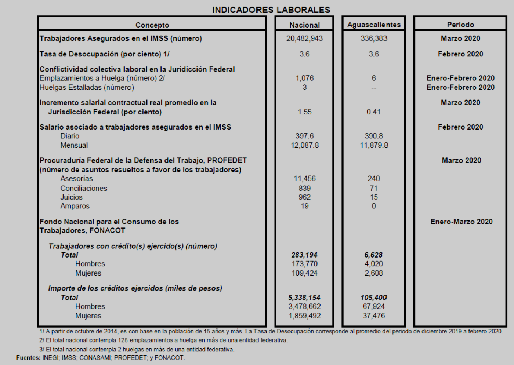 La STPS informó, en su reporte laboral al primer trimestre del 2020, que se encuentran en Aguascalientes 336,383 trabajadores mexicanos asegurados en el IMSS el 1.64% del total, lo que significa una cifra muy superior a la de su participación demográfica del 1.1% nacional. La tasa de desocupación continuó en la misma cifra, ahora idéntica a la del país en general de 3.6%; a diferencia de la de hace unos meses de 3.8%. Después de la contingencia por el Covid-19 seguramente estos datos se incrementarán pero esta lectura será la base para conocer las diferencias.