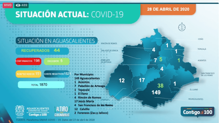En total, son ya 198 casos confirmados de Covid-19 en Aguascalientes, con 10 nuevos casos de contagio sumados hoy. Calvillo suma ya 12 contagios, colocándose como uno de los estados con mayor velocidad de contagio después de Jesús María (17 casos)